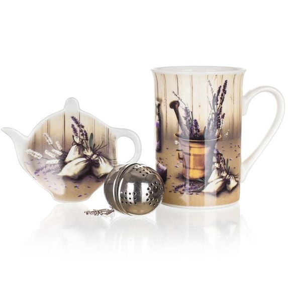 Čajová sada z obľúbenej kolekcie Lavender sa hodí do každej kuchyne. Sada obsahuje keramický hrnček, kovové sitko a odkladaciu tácku. Sada je vyrobená z kvalitnej keramiky a kovu.